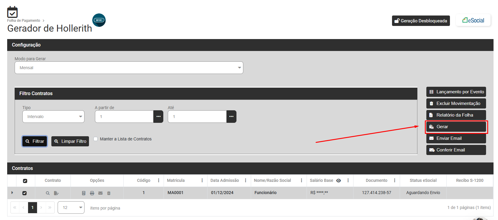 - Se o remuneração deve ser enviada mas não houver evento aguardando envio, aguardando processamento, aguardando correção ou erro de consulta, verifique no menu Folha de Pagamento>Movimentação>Gerar Hollerith, se o hollerith do trabalhador foi gerado