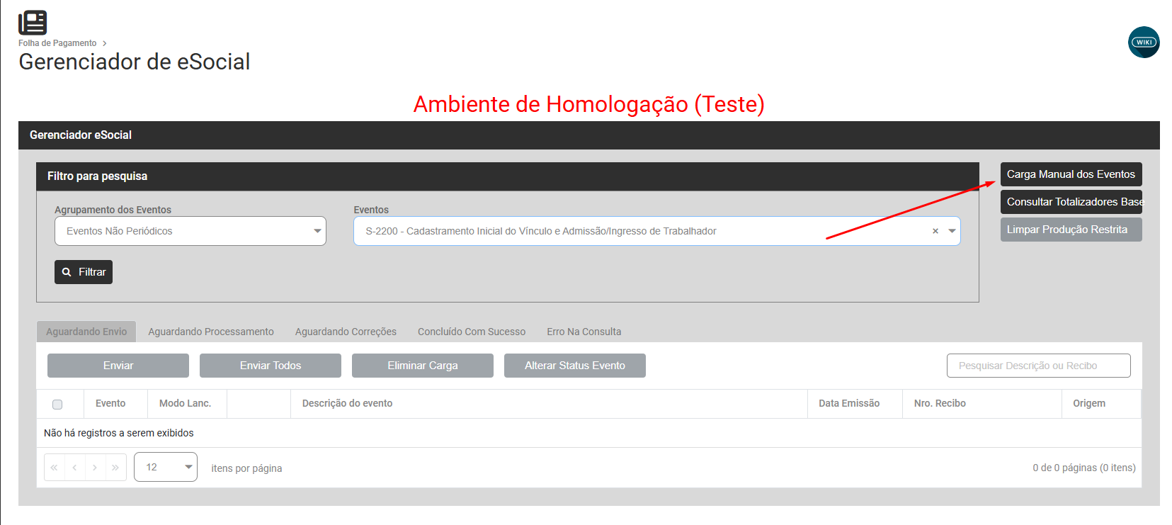 Se o hollerith foi gerado e não houver carga, acesse o Gerenciamento de eSocial e clique no botão Carga Manual dos Eventos
