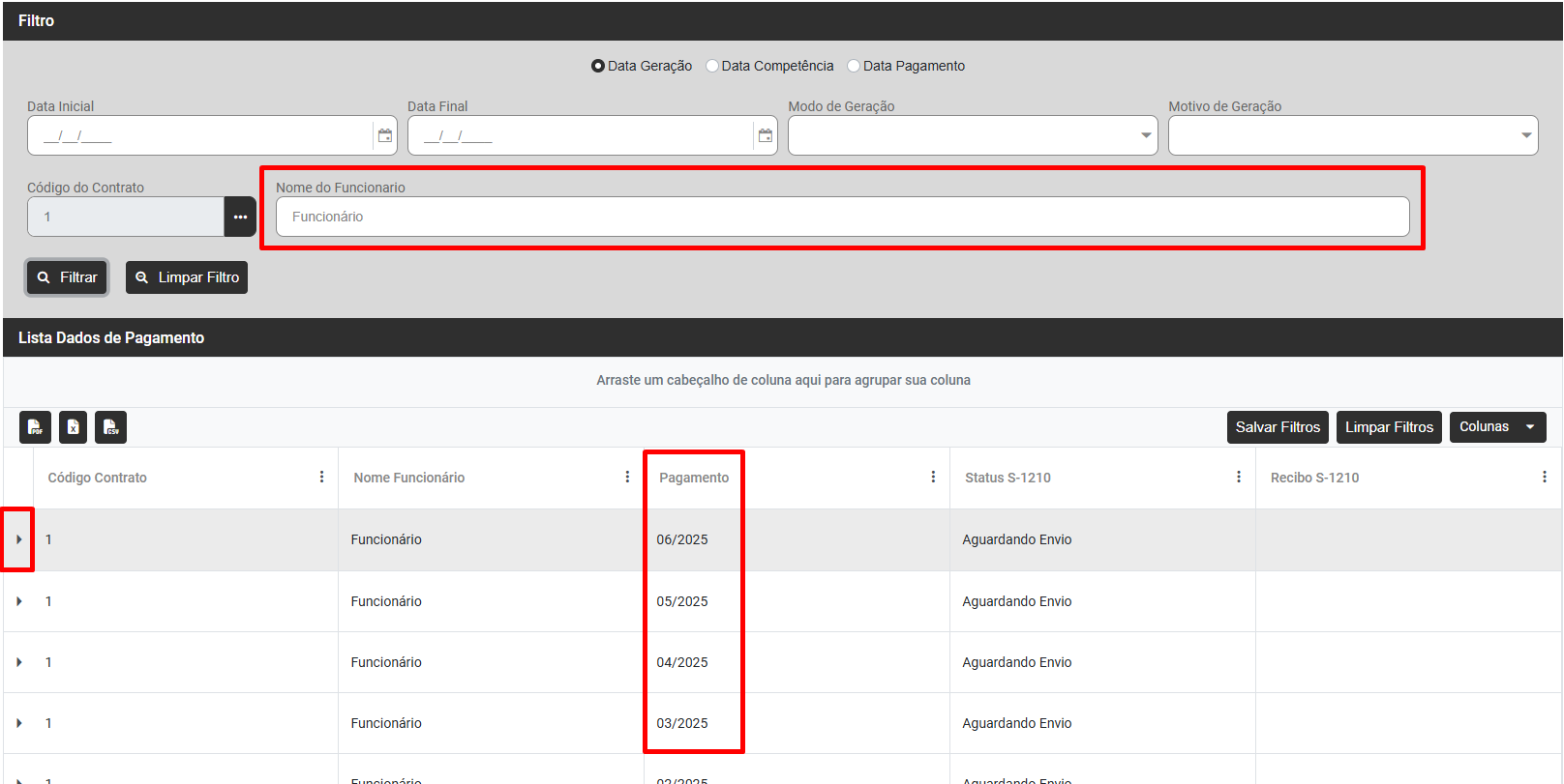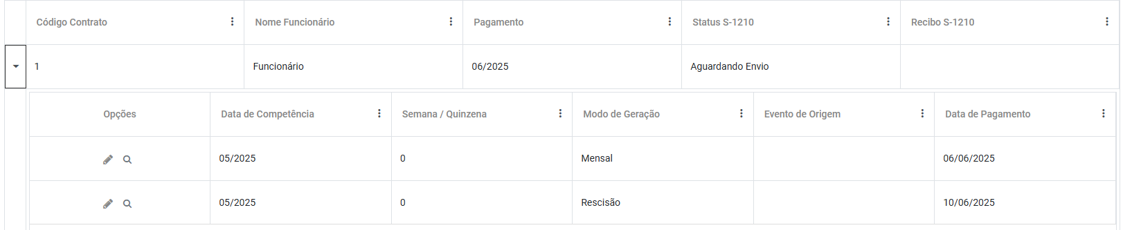 Pesquise pelo código do trabalhador e pelo pagamento que apresentou a inconsistência, em seguida expanda as informações para uma melhor visualização das informações