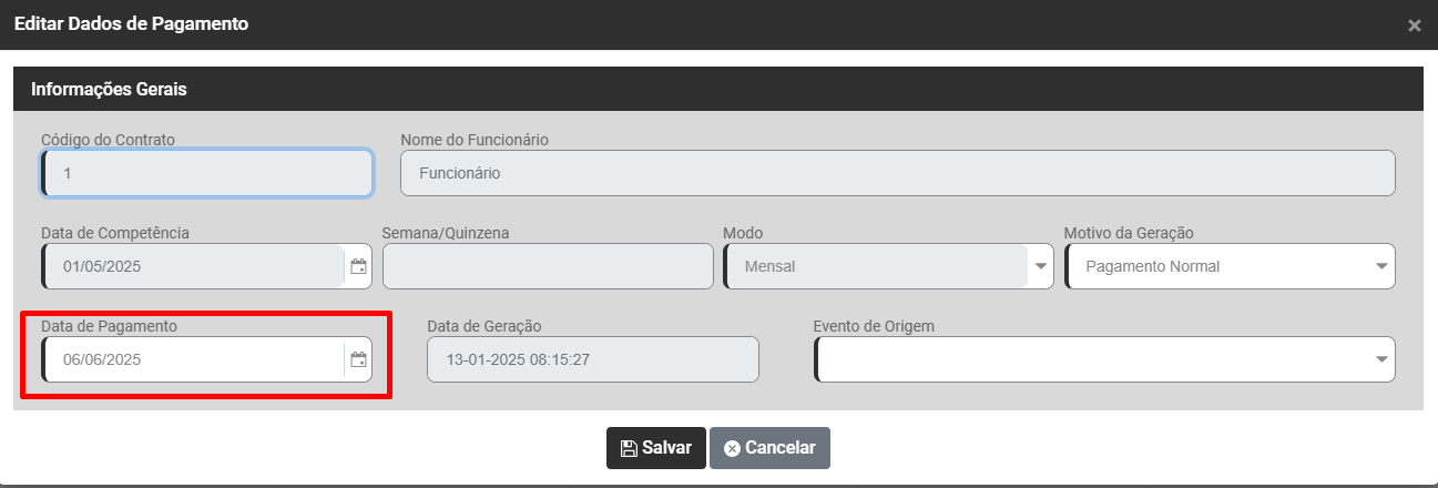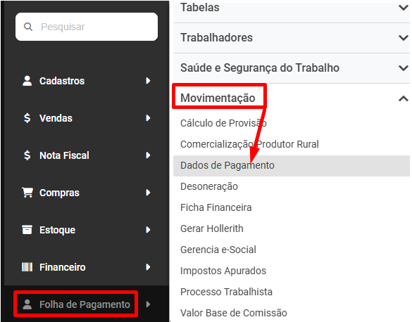 Correção: Acesse o menu Folha de Pagamento>Movimentação>Dados de Pagamento,