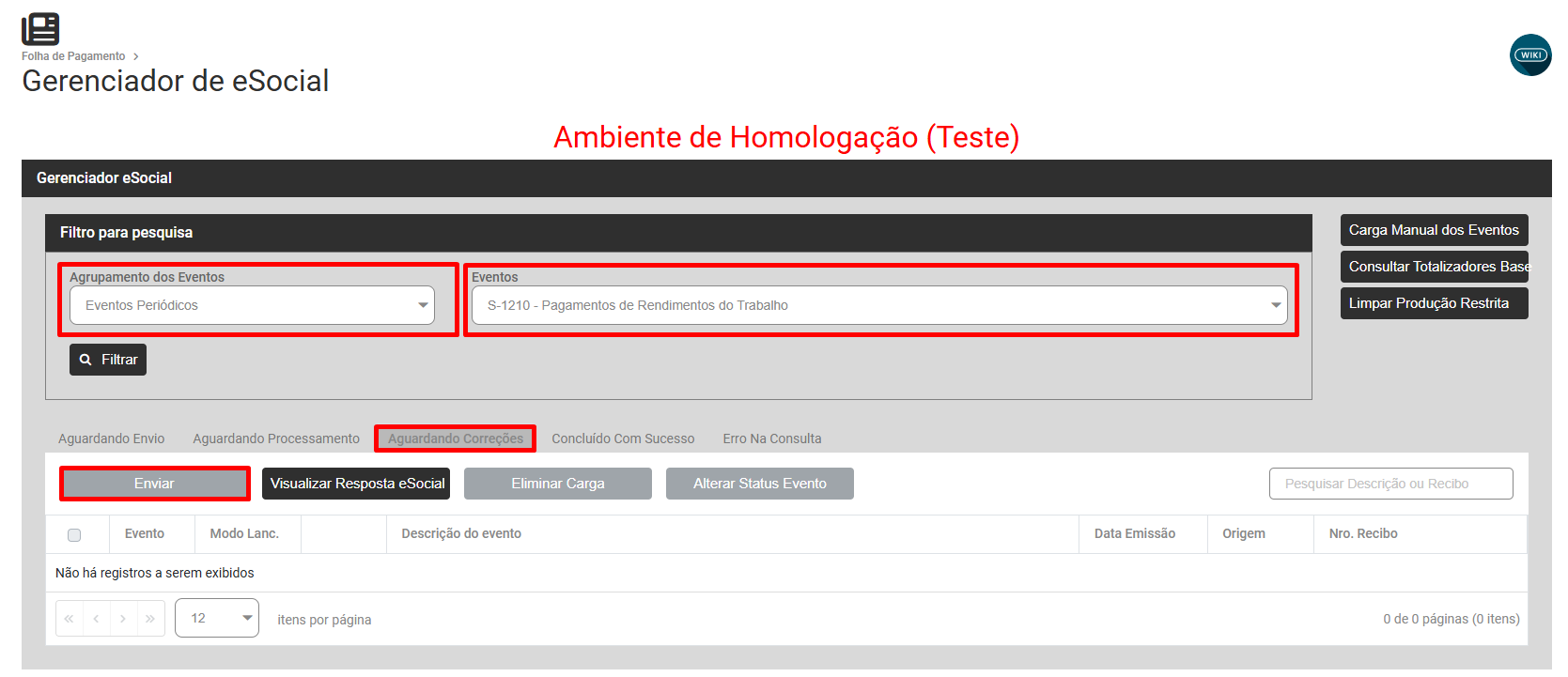 Filtre por Eventos Periódicos - S1210 - Aguardando Correção e reenvie as informações para o Portal do eSocial