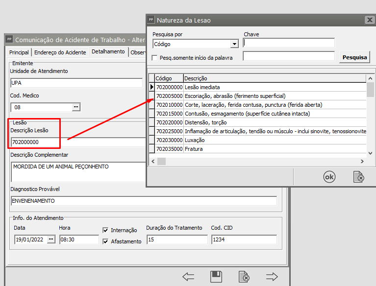 Edite a CAT e acesse a aba Detalhamento, verifique o código informado no campo Lesão>Descrição Lesão
