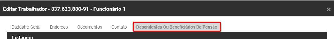 Edite os Dados Pessoais do Trabalhador que apresentou a inconsistência e acesse a aba Dependentes ou Beneficiários de Pensão