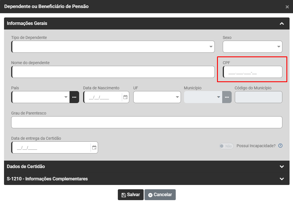 Edite o cadastro do Dependente e faça a conferência do Campo CPF