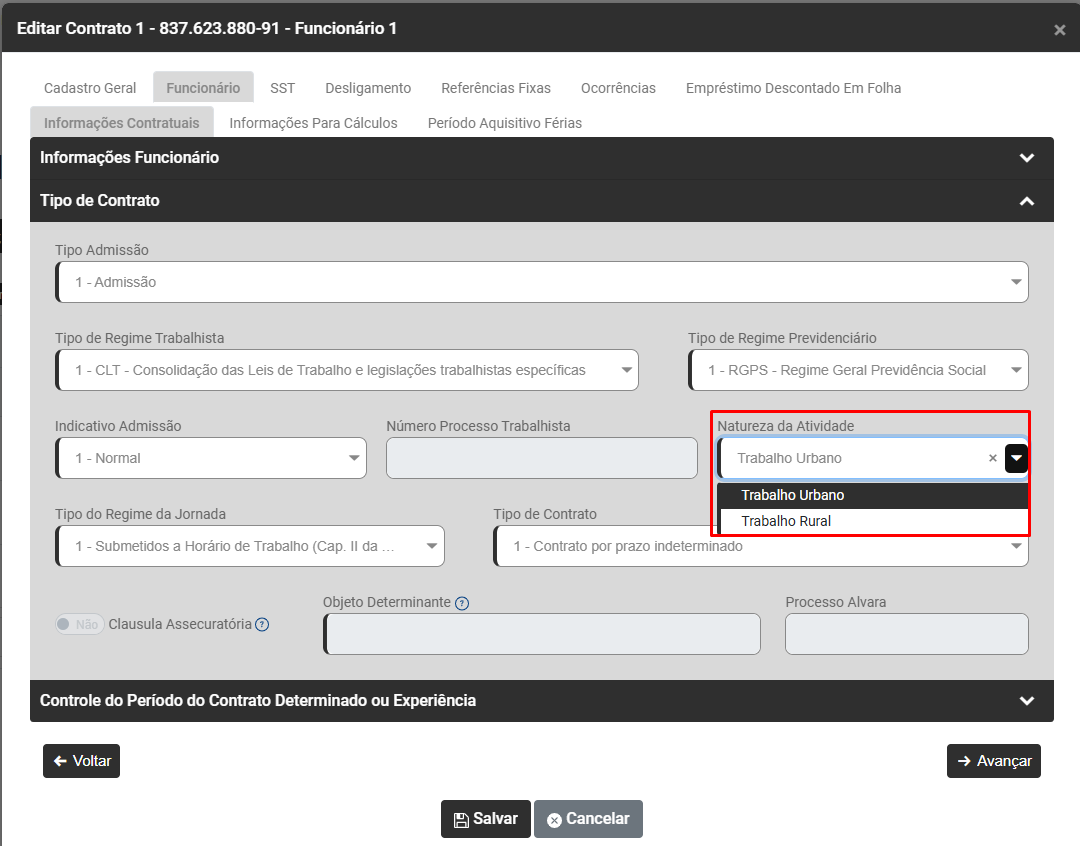 Em seguida acesse a aba Funcionário>Informações Contratuais - Campo Natureza da Atividade