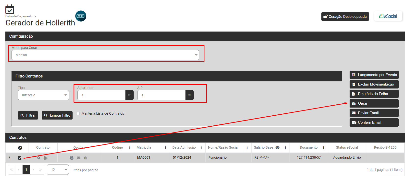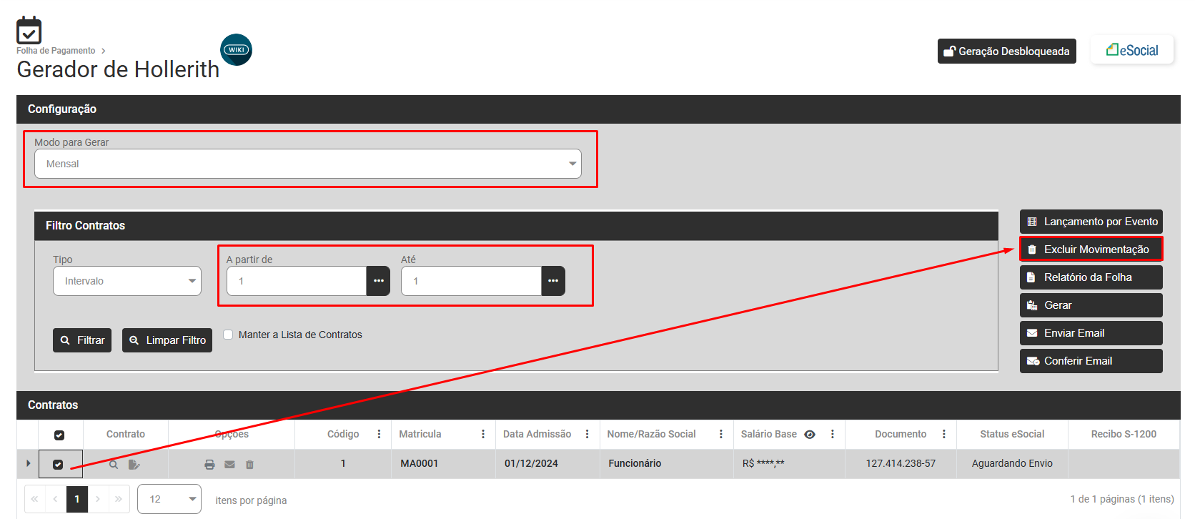 Defina o Modo para Gerar cujo XML está errado, filtre pelo Código do trabalhador e em seguida Exclua a Movimentação