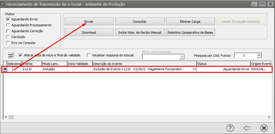 b) Caso o S2299 esteja com outro Status, por exemplo Aguardando processamento, aguarde até que esteja processado para realizar o reenvio do S-1210;