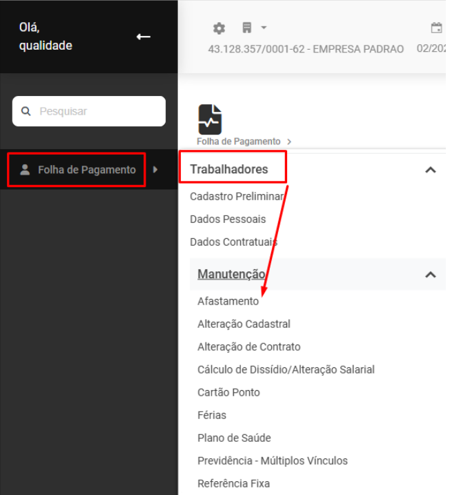 Correção: Acesse o menu Folha de Pagamento>Trabalhadores>Manutenção>Afastamentos
