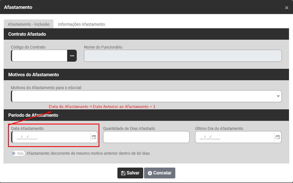 Ação Sugerida: A data não pode ser superior à data atual, exceto se o motivo do afastamento for férias, situação em que pode ser até 60 dias superior à data atual.