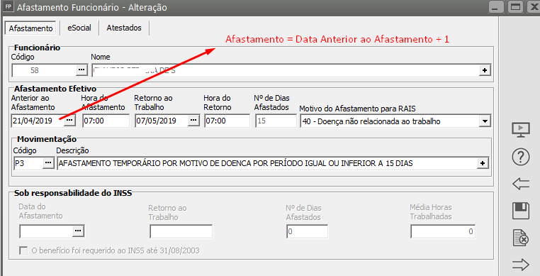 Ação Sugerida: A data não pode ser superior à data atual, exceto se o motivo do afastamento for férias, situação em que pode ser até 60 dias superior à data atual.