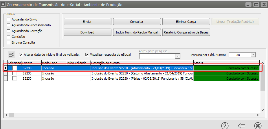 Em seguida acesse o Gerenciamento de Transmissão do eSocial e verifique qual a data que você está enviando o evento S2230 para o Portal do eSocial, essa data não poderá ser anterior a data do afastamento.