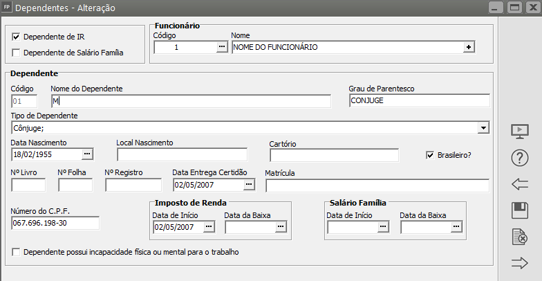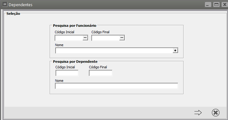Correção: Acesse o menu Manutenção > Dependentes > Funcionários > Manutenção, pesquise pelo Código do Funcionário e clique na seta Avança.