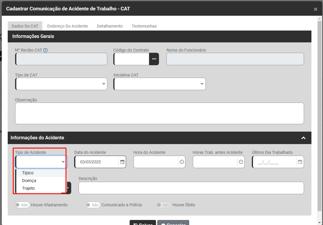 Edite a CAT do Trabalhador que apresentou a inconsistência e confira na aba Dados da CAT>Informações do Acidente - Campo Tipo de Acidente qual foi o Tipo de Acidente informado