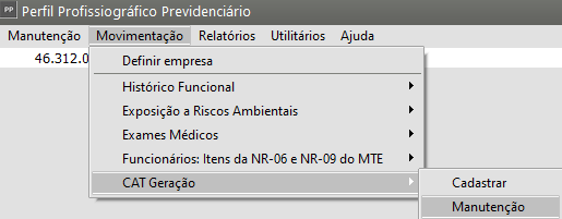 Correção: Acesse o Sistema PPP no menu Movimentação > CAT Geração > Manutenção e pesquise pela CAT emitida
