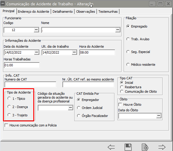 Edite a CAT (Comunicação de Acidente de Trabalho) e verifique a informação cadastrada no campo Tipo de Acidente
