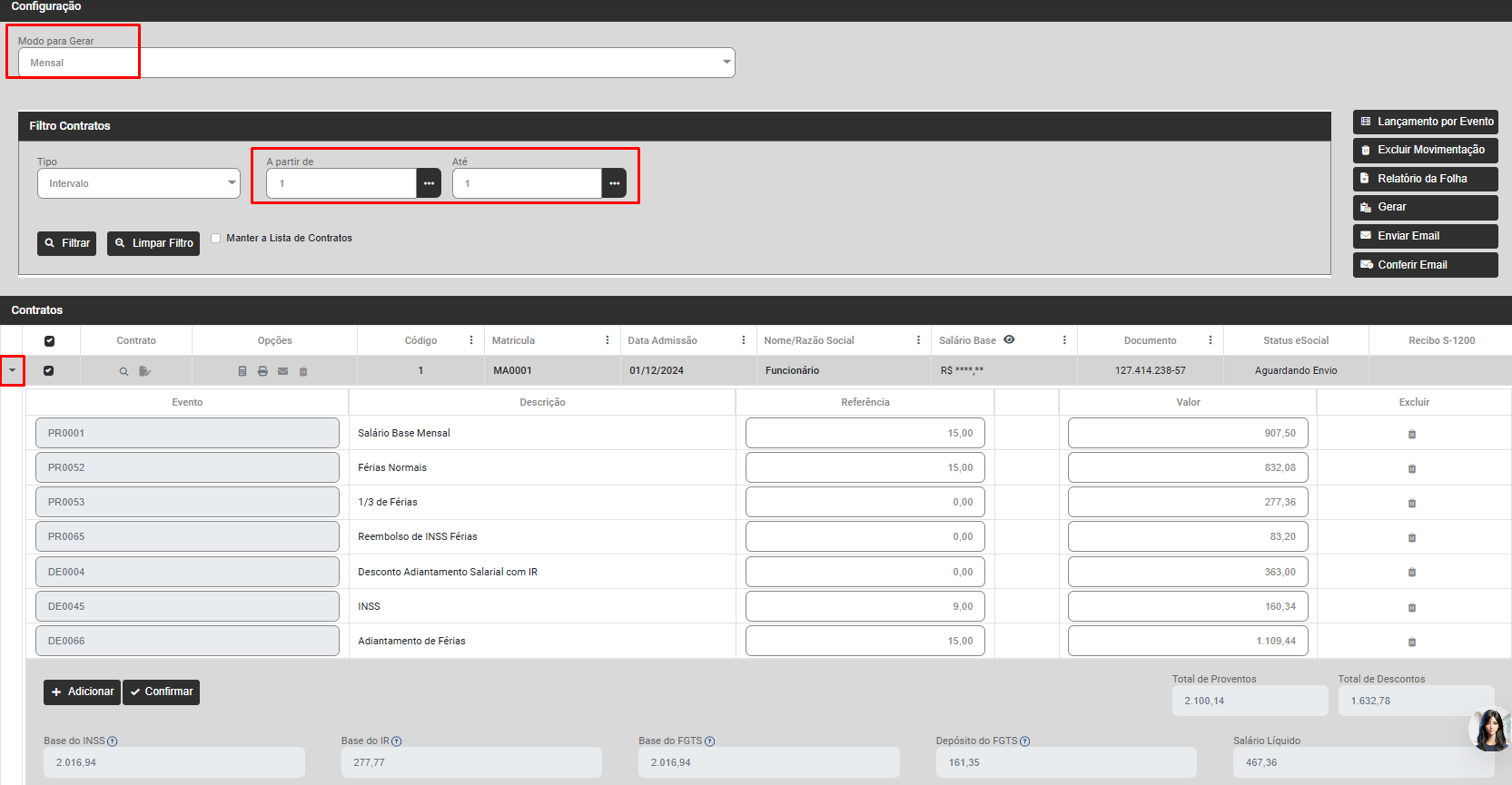 Defina o Modo para Gerar, filtre o funcionário e expanda as informações