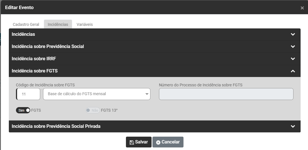 Edite o Evento e acesse a aba INCIDÊNCIAS e confira se o código informado no campo Incidência sobre FGTS está cadastrado corretamente.