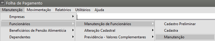 Correção: Acesse o menu Manutenção > Funcionários > Manutenção de Funcionários > Manutenção e pesquise pelo código do Funcionário e clique na seta Avança