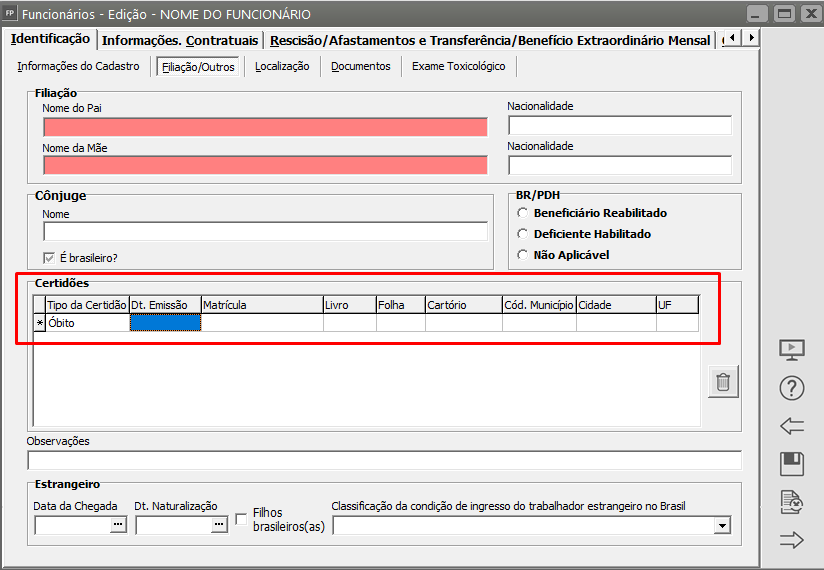 Em seguida edite o cadastro do funcionário na aba Identificação, sub aba Filiação/Outros e confira as informações cadastradas no campo Certidões