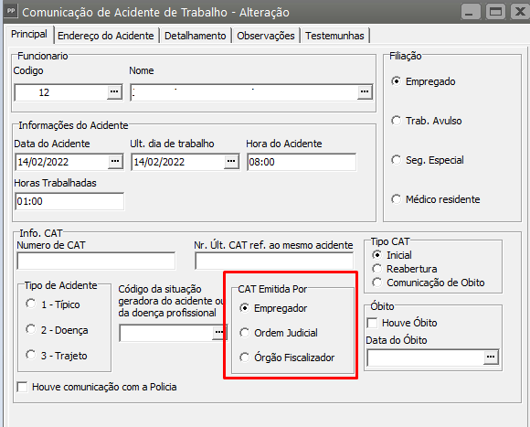 Edite a CAT e verifique a informação do campo CAT Emitida por: