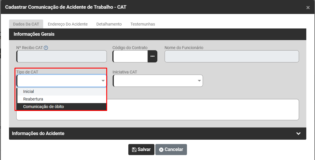 Verifique se o campo Tipo de CAT foi Comunicação de Óbito, se Sim, obrigatoriamente o campo Comunicação de Óbito deve ser selecionado.