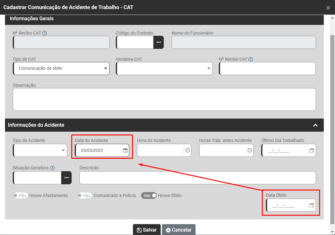 Obs: A data do óbito não poderá ser anterior a data do acidente.