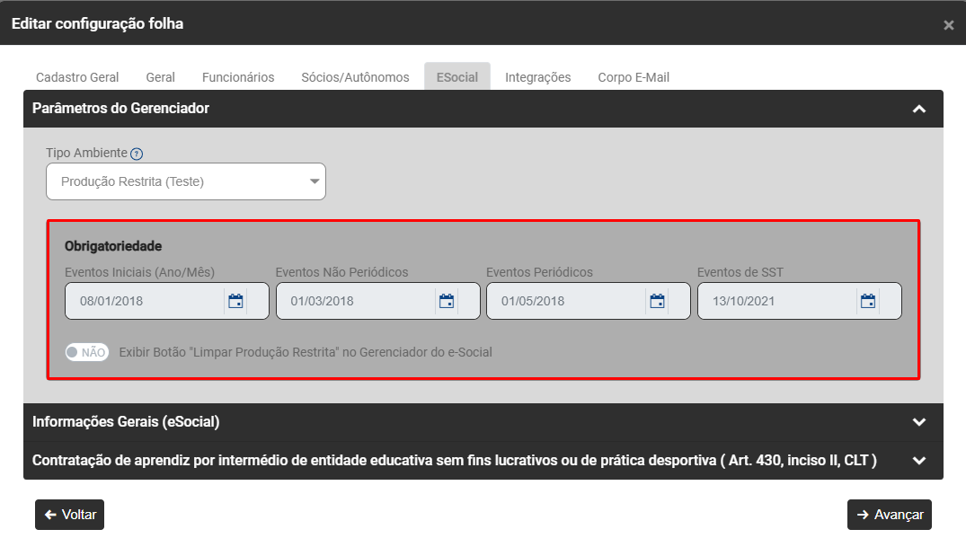 Faça a conferência e correção das Datas informadas no campo Obrigatoriedade
