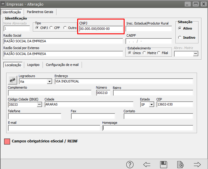Correção: Acesse o menu Manutenção > Empresas > Dados Cadastrais > Manutenção, pesquise pela Empresa e clique na seta Avança
