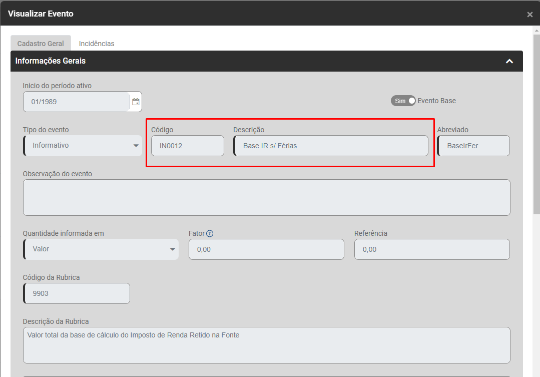 Edite o Eventos que apresentou a inconsistência, em nosso exemplo iremos utilizar o evento IN0012 (Base de IR sobre Férias)
