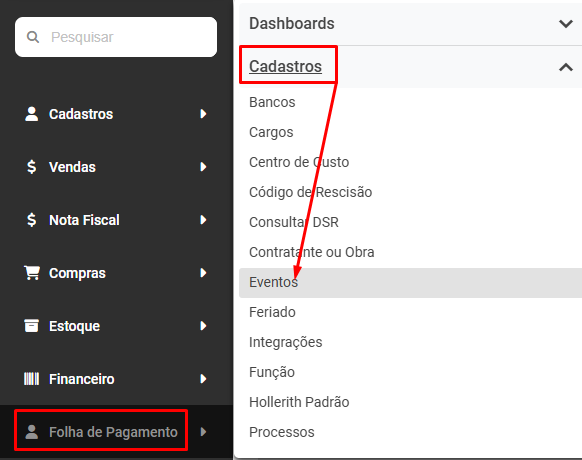 Correção: Acesse o menu Folha de Pagamento>Cadastros>Eventos