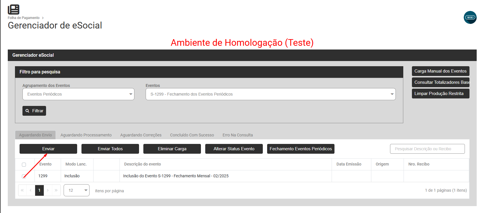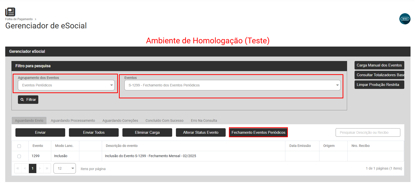 Envie todos os eventos do período e em seguida filtre por Eventos Periódicos - S1299, Aguardando Envio e clique em Fechamento Eventos Periódicos