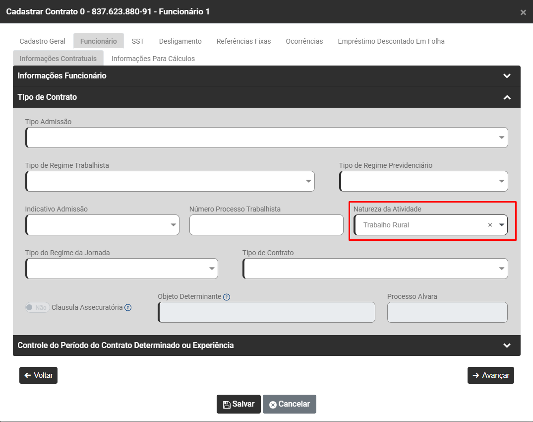 Acesse a aba Funcionário>Informações Contratuais - Campo Tipo de Contrato>Natureza da Atividade e informe Trabalhador Rural