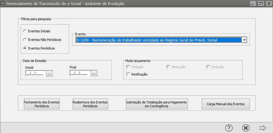 Gerenciamento de Transmissão do eSocial, pesquise pelo Evento Periódico S1200 (Remuneração do trabalhador vinculado ao Regime Geral de Previdência Social) e clique na seta Avança.