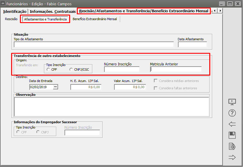 - No cadastro do funcionário acesse a aba ‘Rescisão/Afastamentos e Transferência/Benefício Extraordinário Mensal>Afastamentos e Transferência’ e verifique se todos os campos da empresa de origem estão preenchidos, incluindo número de inscrição e principalmente a matrícula do funcionário.