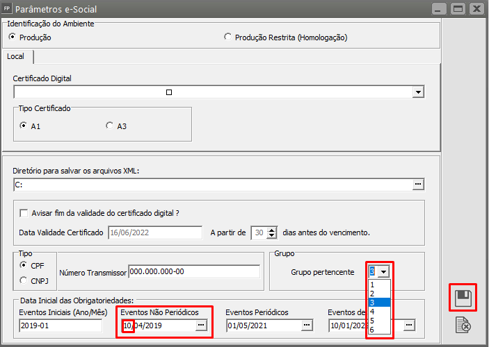 Defina novamente o grupo da empresa e, caso ela seja grupo 3, altere a data dos eventos não periódicos para 10/04/2019 e salve.