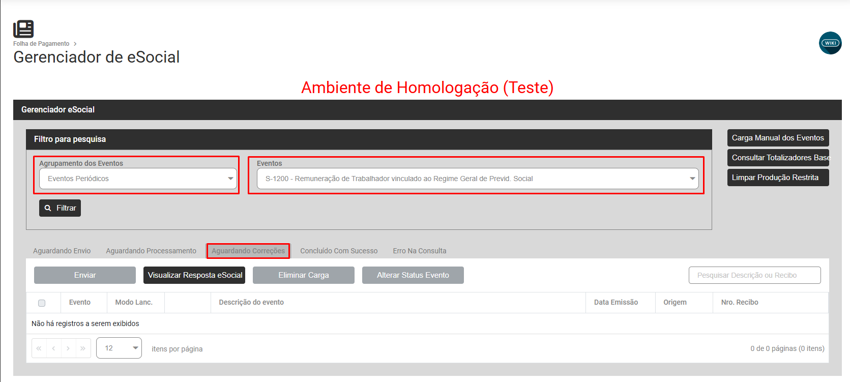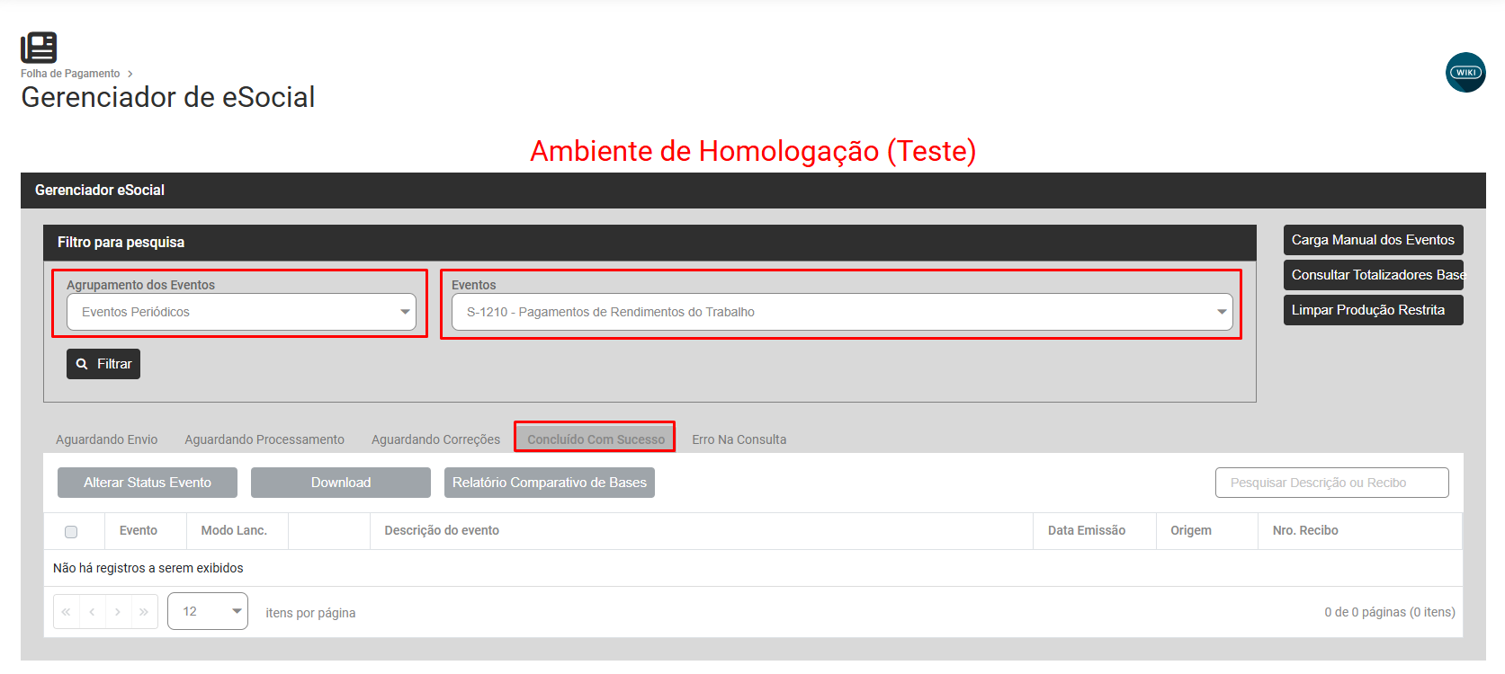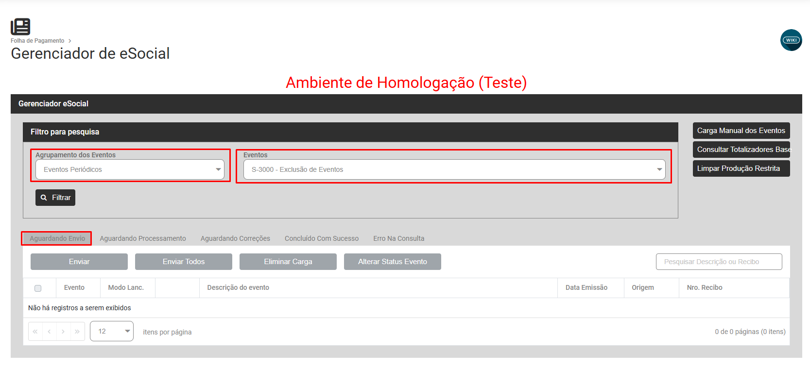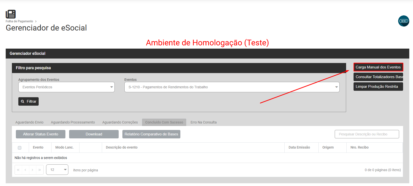 Para realizar a exclusão do evento S1210, clique no botão Carga Manual dos Eventos