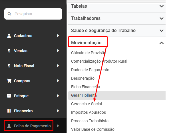 Correção: Acesse o menu Folha de Pagamento>Movimentação>Gerencia eSocial