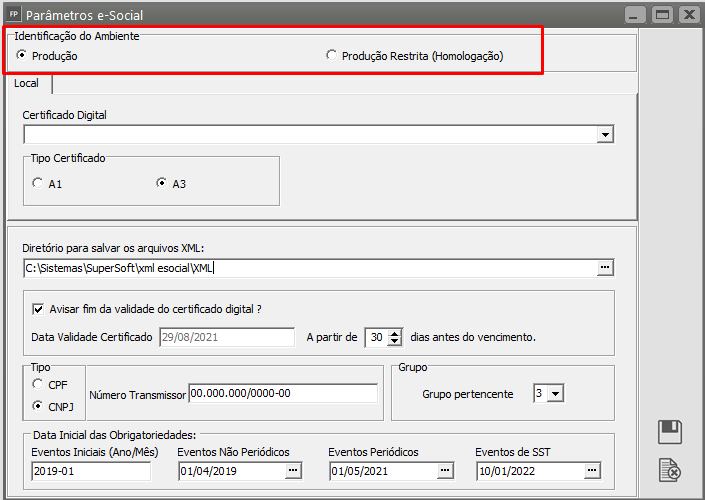 - Caso esteja selecionado Produção Restrita (Homologação) as informações que forem enviadas para o eSocial estarão em testes e não surtirão nenhum efeito legal