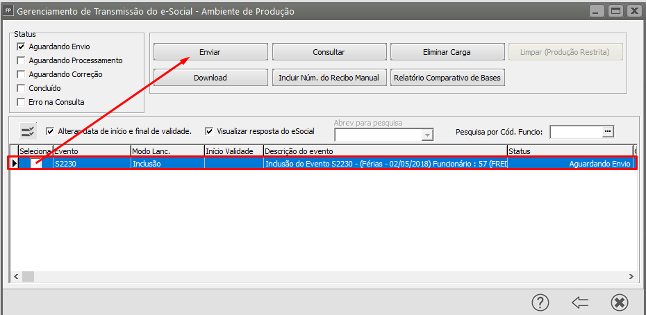 Após a conferência das informações e correção caso haja necessidade acesse o Gerenciamento de Transmissão do eSocial, pesquise pelo Evento Não Periódico S2230 e clique na seta Avança