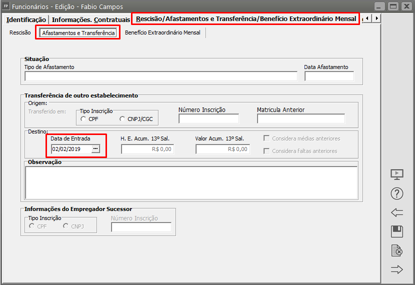 - No cadastro do funcionário acesse a aba ‘Rescisão/Afastamentos e Transferência/Benefício Extraordinário Mensal>Afastamentos e Transferência’ e verifique a ‘Data de Entrada’ informada’: