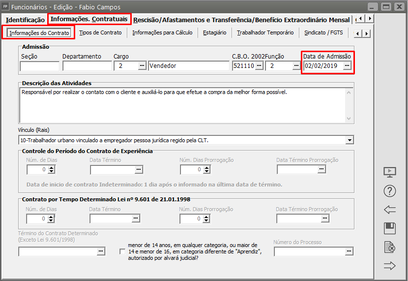 - Ainda no cadastro do funcionário, acesse agora ‘Informações Contratuais>Informações do Contrato’ e verifique se a ‘Data de Admissão’ é a mesma informada na parte da transferência.