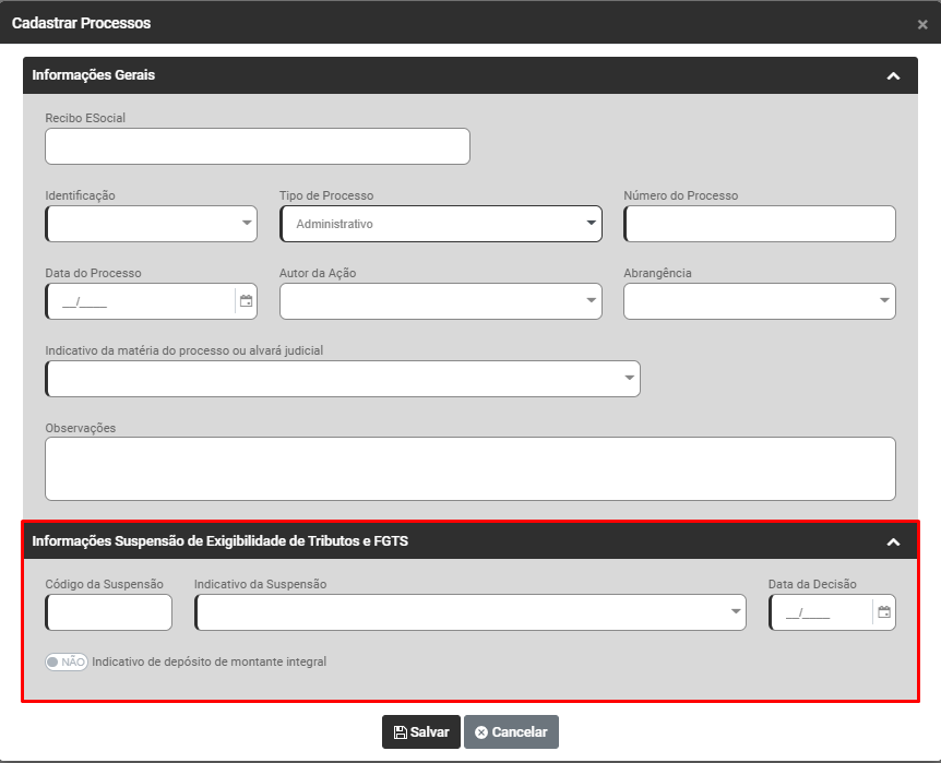 Edite o Processo cadastrado e certifique-se que as informações estão corretamente cadastradas e que esse tipo de processo pode ser utilizado para suspensão de débitos tributários perante a RFB
