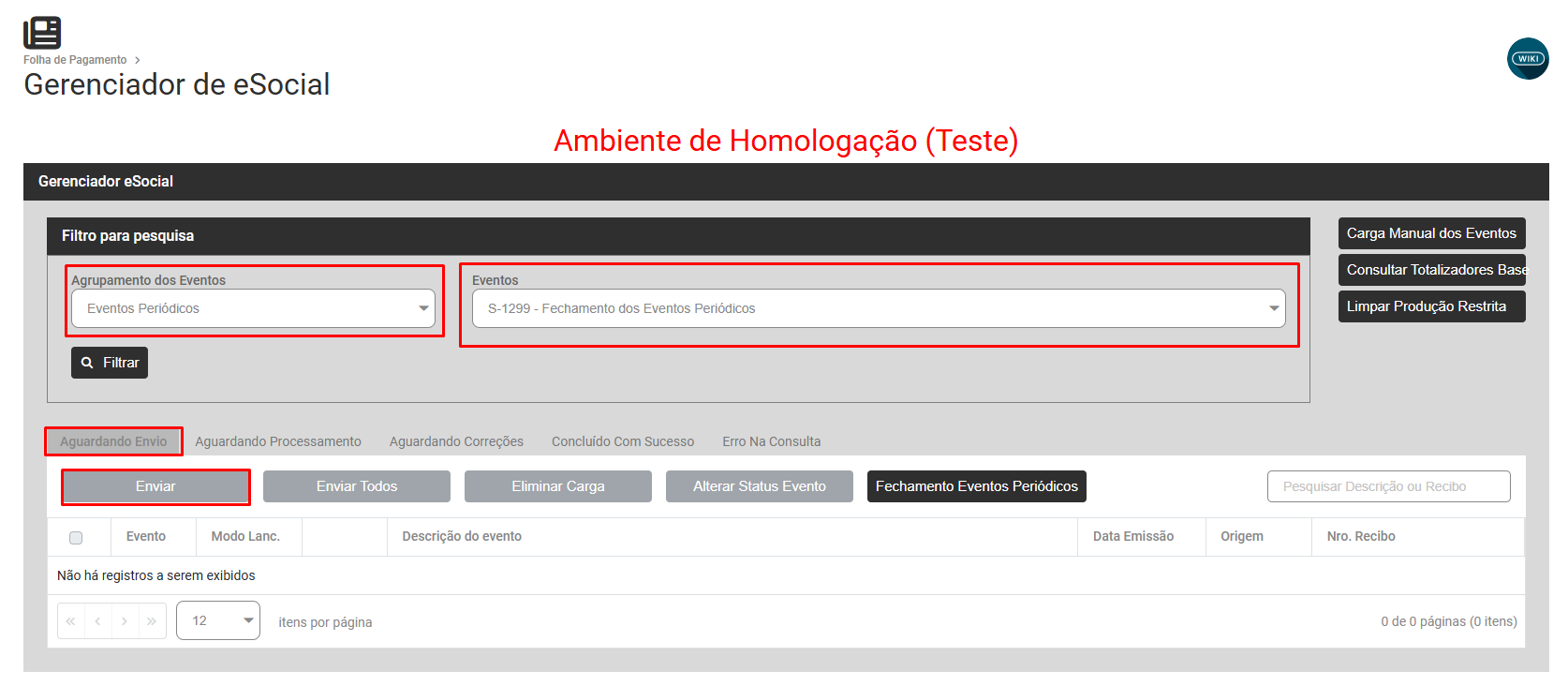 Filtre por Eventos Periódicos S1299 Aguardando Envio e faça o envio para o Portal do eSocial