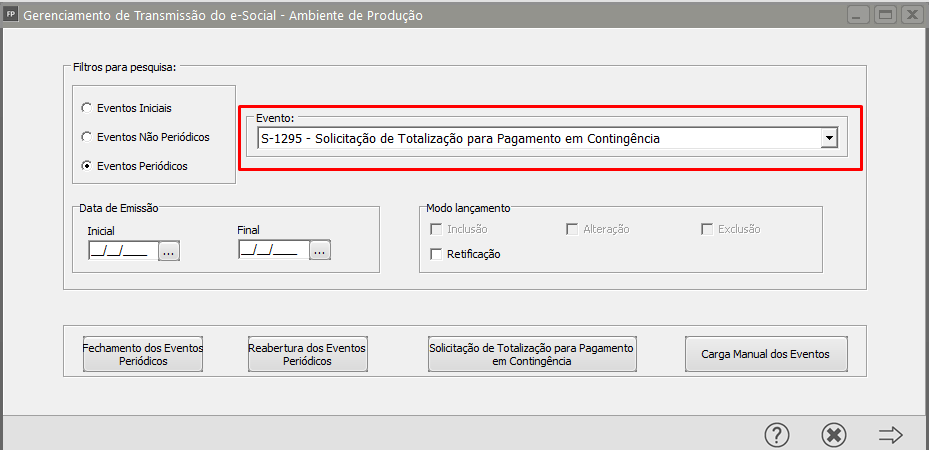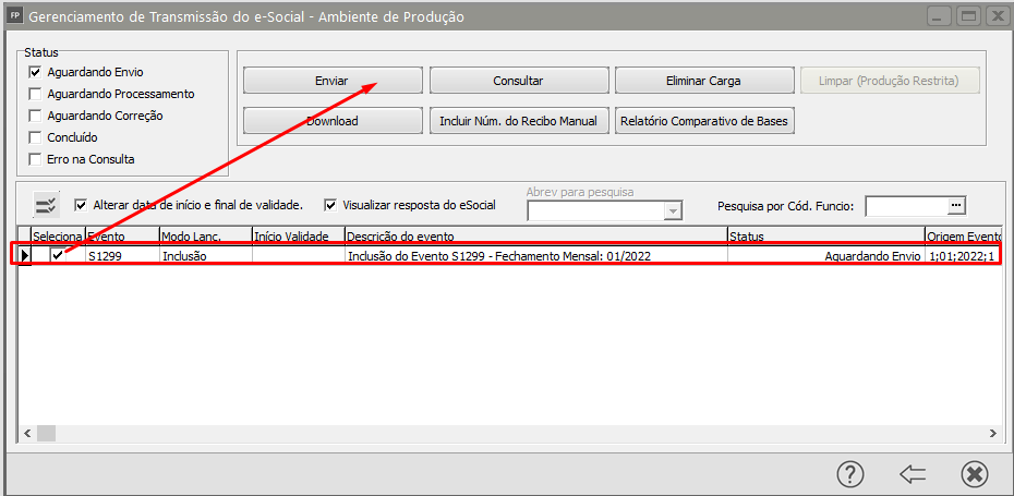 Como o Portal já possui o evento de em continência, bastará que você faça o envio do evento S1299 (Fechamento dos Eventos Periódicos), acesse o menu Gerenciamento de Transmissão do eSocial, pesquise pelo evento S-1299 e clique na seta Avança