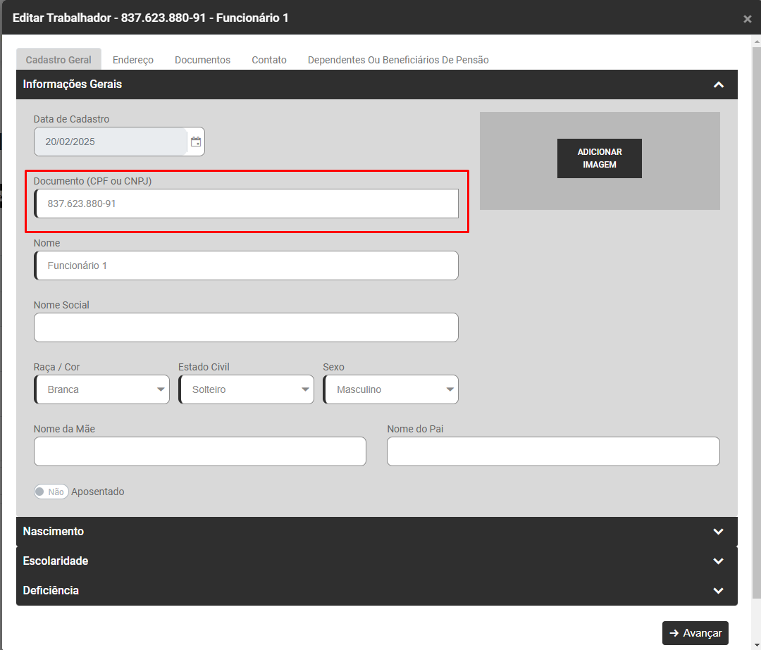 Edite os Dados Pessoais do Trabalhador que apresentou a inconsistência na aba Cadastro Geral>Informações Gerais - Campo Documento CPF ou CNPJ faça a conferência da informação