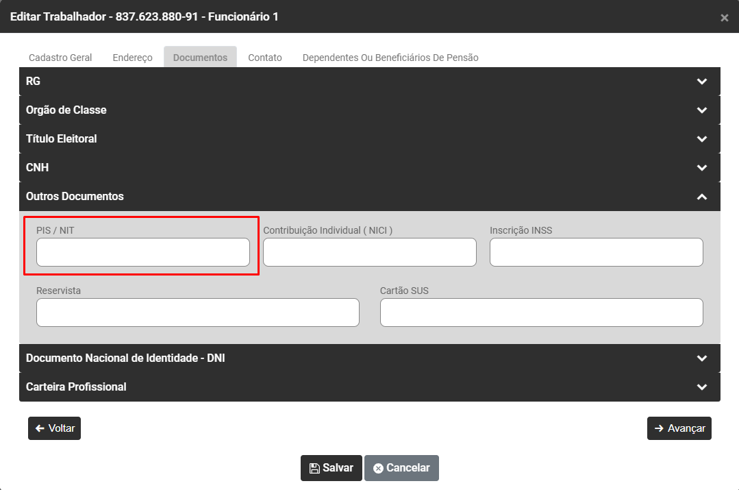 Na aba Documentos - Campo Outros Documentos e confira o número do PIS