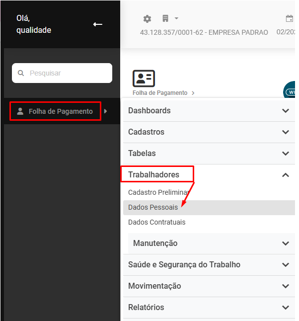 Solução: Acesse o menu Folha de Pagamento>Trabalhadores>Dados Pessoais