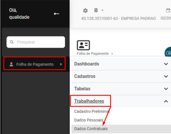 Correção: Acesse o menu Folha de Pagamento>Trabalhadores:>Dados Contratuais