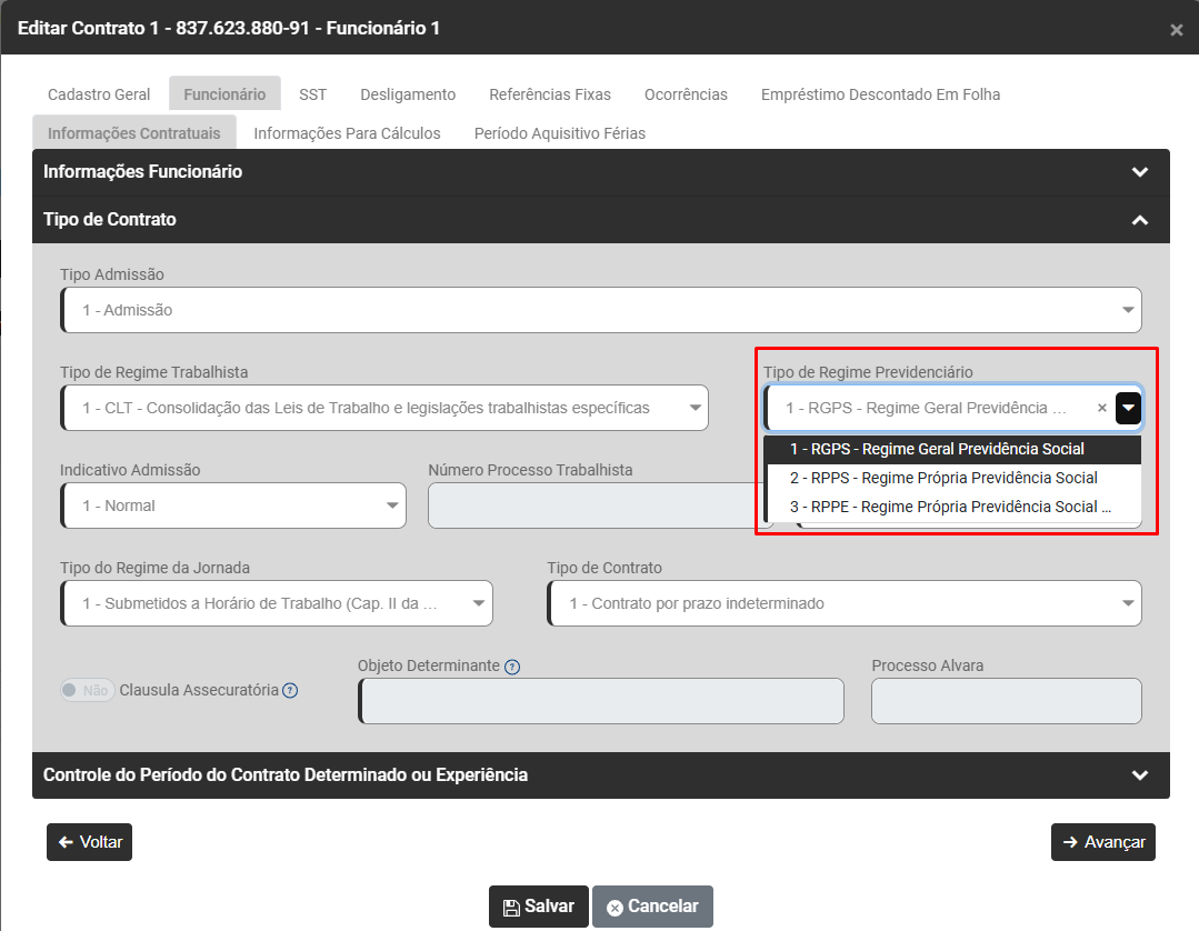 Verifique a informação preenchida no campo "Tipo de regime Previdenciário", faça o ajuste necessário e salve a informação