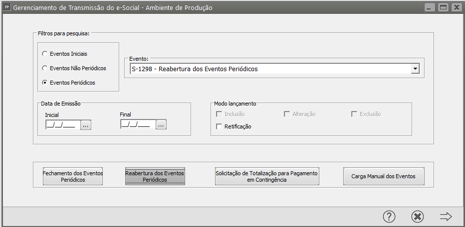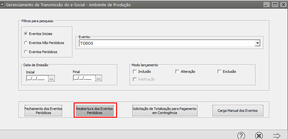 Correção: Acesse o Gerenciamento de Transmissão do eSocial e clique no botão Reabertura dos Eventos Periódicos